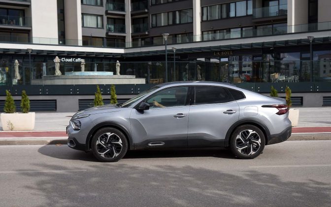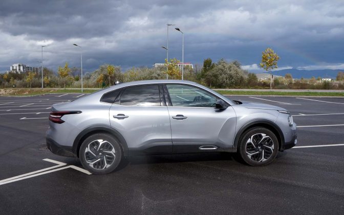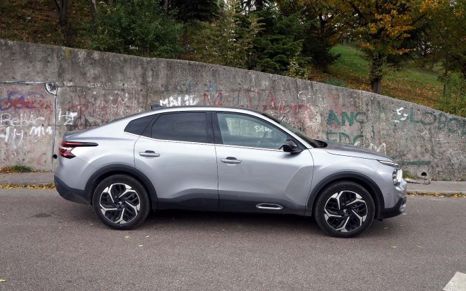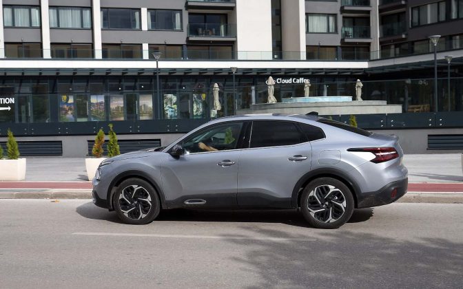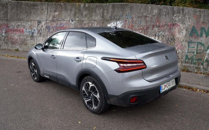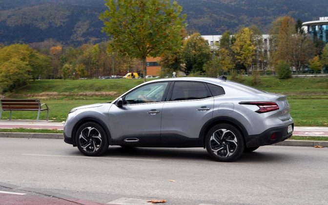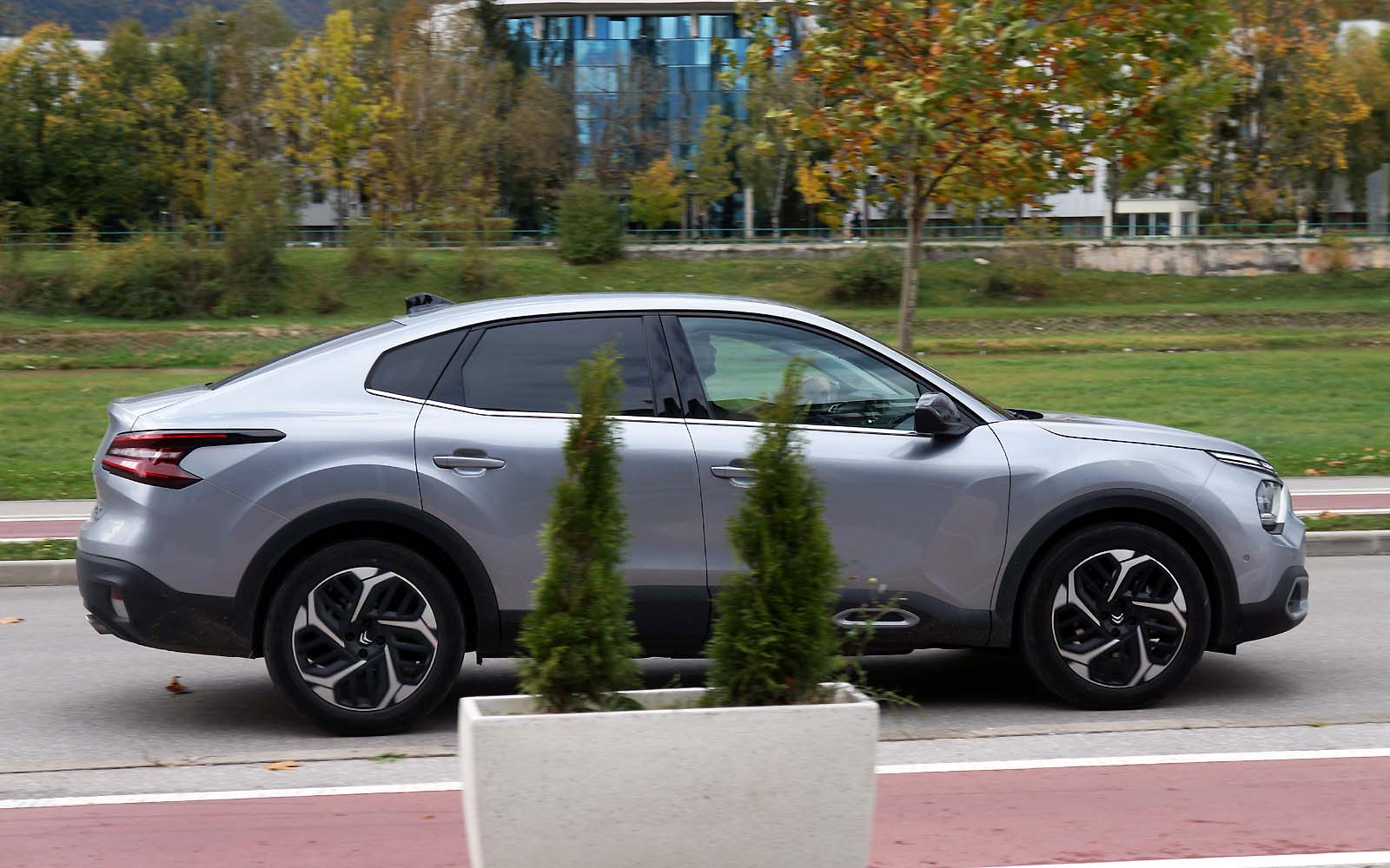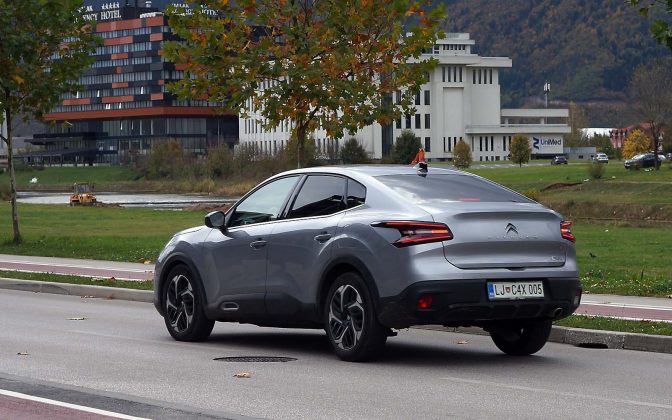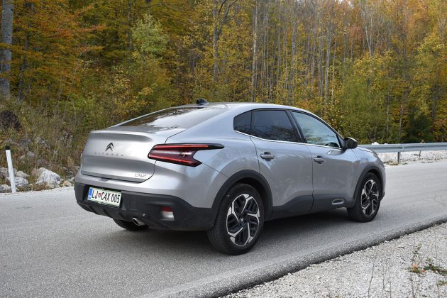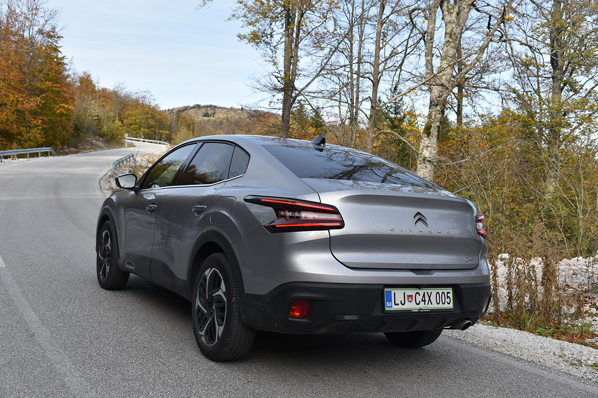 Drugačije rečeno, prednji dio Citroëna C4 X se gotovo i ne razlikuje od Citroëna C4, ali stražnji dio je drugačiji. Stražnje vejtrobransko staklo se blago spušta prema poklopcu prtljažnika, koji je blago podignut i ima funkciju spoilera. Takva silueta izgleda elegantno i atraktivno, te predstavlja svojevrsnu avangardu u C segmentu. Naime, dosta često takvi automobili izgledaju neskladno, pa stražnji dio izgleda kao “nakalemljen” na već od ranije poznati hatchback, što kod Citroëna C4 X nije slučaj, ni približno.
