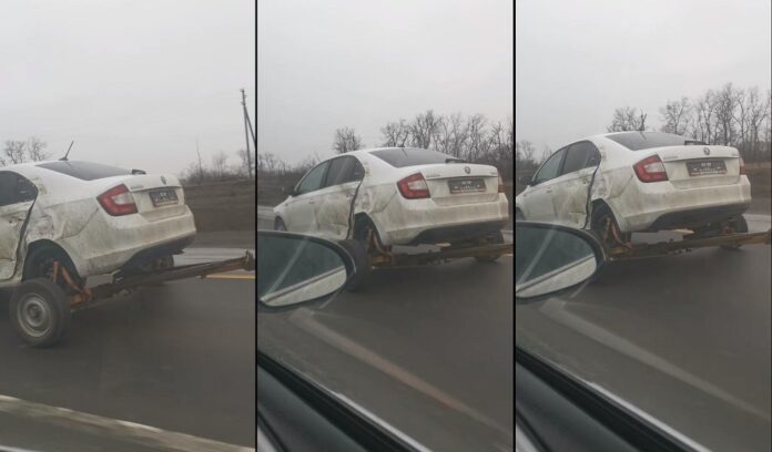 Posljednjih godina mogli smo vidjeti da maštoviti vozači voze svoje razbijene ljubimce bez točkova, cijelih elemenata ovjesa, pa i s podignutim poklopcem, no ovo je prvi primjer simbioze automobila i prikolice na ovakav način.